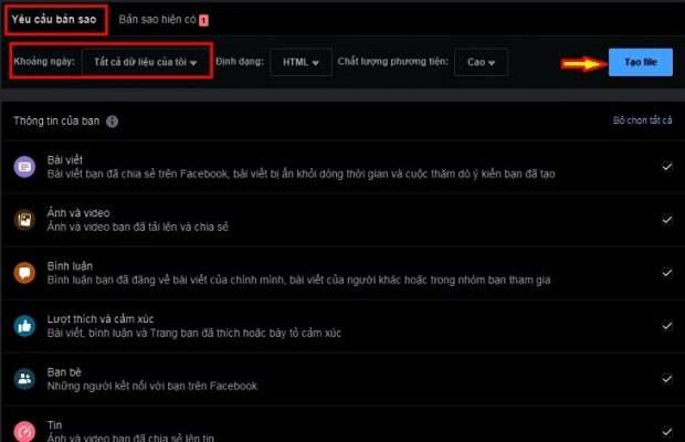 Bước 4: Lúc này một cửa sổ mới sẽ hiện lên -> Click chọn Yêu cầu bản sao và chọn Khoảng ngày mà bạn muốn lấy lại tin nhắn -> Chọn Tạo file
