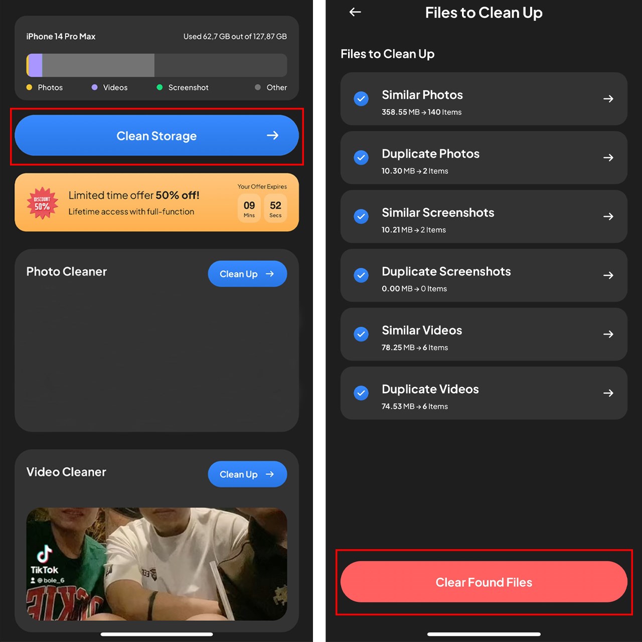 Bước 2: Chọn Clean Storage > Hệ thống sẽ tự động dọn dẹp đến 100% > Sau đó, bạn sẽ nhận được kết quả. Tại đây, có thể lựa chọn Clear Found Files để xóa các file không cần thiết.
