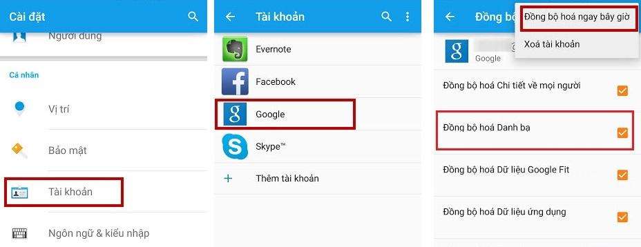 Sau đó chọn vào mục “Đồng bộ” > Chọn vào mục “Danh bạ” > Đồng bộ ngay.