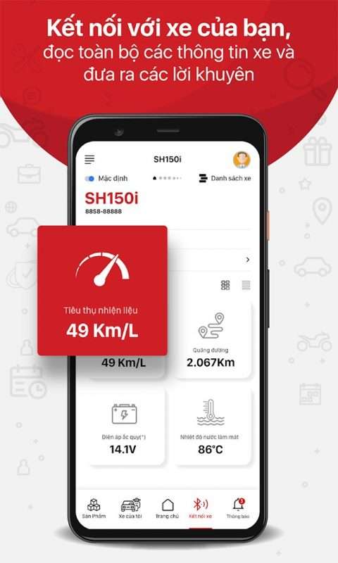 Một số xe đời mới 2019 và SH150i 2020 mới ra mắt, l Ứng dụng My Honda + sẽ hỗ trợ thêm chức năng kết nối. Và sau khi đăng nhập, bạn có thể xem được tất cả các thông tin về quãng đường đã đi; mức tiêu hao nhiên liệu; nhiệt độ động cơ … trên mọi chuyến đi.