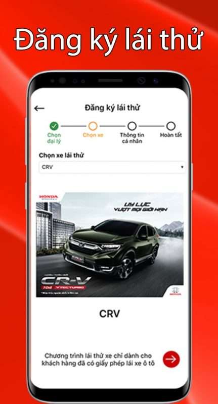 Tính năng lái thử xe là tính năng dành cho các bạn quan tâm đến các loại xe 4 bánh. My Honda + giúp bạn đăng ký lái thử một cách dễ dàng và thuận tiện chỉ trong 4 bước: Chọn xe => Chọn đại lý => Nhập dữ liệu đăng ký => Gửi yêu cầu cung cấp thông tin. Để có trải nghiệm tốt hơn trước khi quyết định mua hàng.