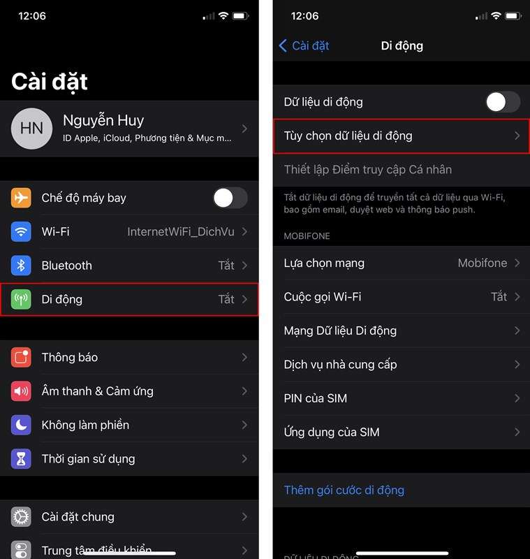 Bước 1. Bạn vào Cài đặt > Di động > Tùy chọn dữ liệu di động.
