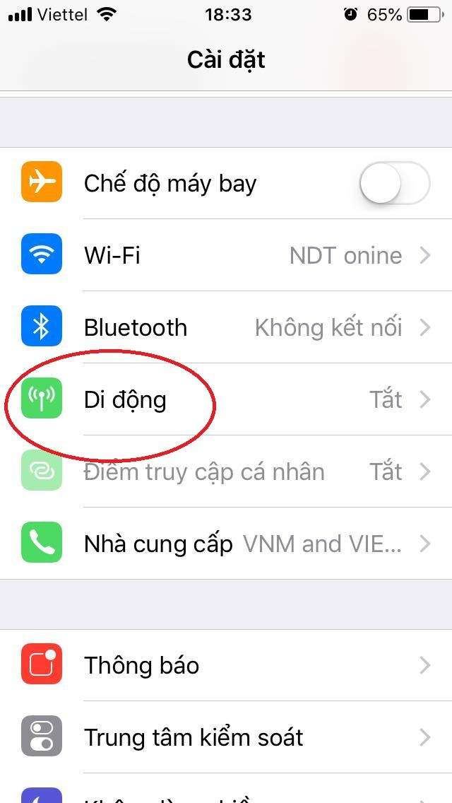 Vào mục Cellular (Di động)