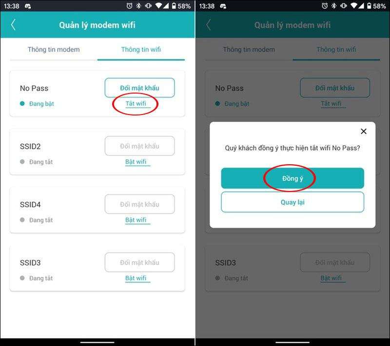 Nhấn vào Quản lý Modem để toàn quyền thực hiện từ xa nhé! - Bước 5: Nhấn vào nhóm Thông tin WiFi. Sau đó nhấn vào Tắt WiFi là xong. Ngay lập tức mạng WiFi sẽ được ngắt.