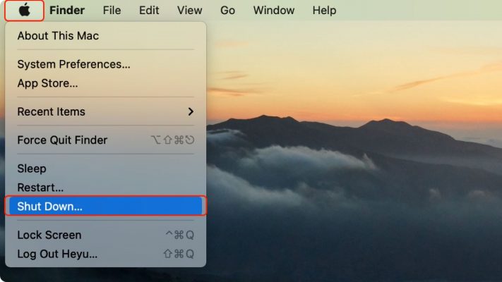 Trước khi làm sạch, bạn cần tắt MacBook yêu quý của mình. Tiếp theo, bạn cần ngắt kết nối bất kỳ thiết bị ngoại vi nào vẫn được kết nối với máy. Nhấp vào ” Logo Apple” => Nhấp chọn “Shutdown”.