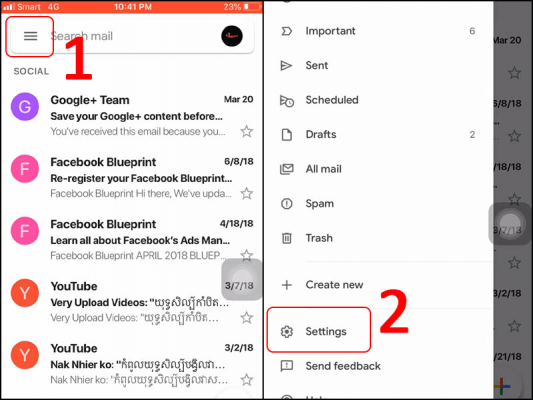 Bước 1. Đăng nhập ứng dụng Gmail => Nhấp chọn biểu tượng 3  gạch ngang (Menu) => Bấm Cài đặt (Setting)