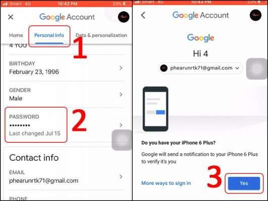 Bước 3. Vào Thông tin cá nhân (Personal info) => chọn MẬT KHẨU (PASSWORD) => Xác minh danh tính cá nhân => chọn (Yes)