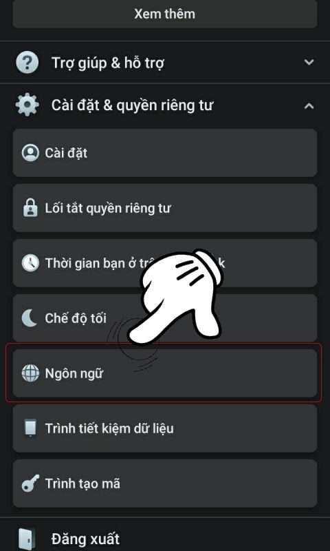 Bước 1. Vào Facebook chọn Cài đặt quyền riêng tư => Bấm vào Ngôn ngữ.