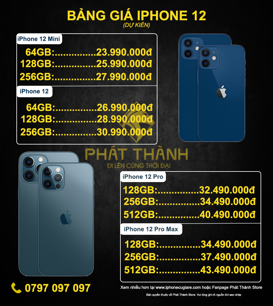 Bạn đang cần tham khảo giá bán iPhone 12, hiện giá bán mà nhà sản xuất đưa ra hiện đã công bố tại buổi ra mắt iPhone 12 ngày 13/10/2020 nhưng đó là giá bán xuất xưởng, khoản thời gian iPhone 12 về tới Việt Nam sẽ không còn xa ! Các bạn hãy xem ngay giá bán iPhone 12 tại Phát Thành Store nhé !