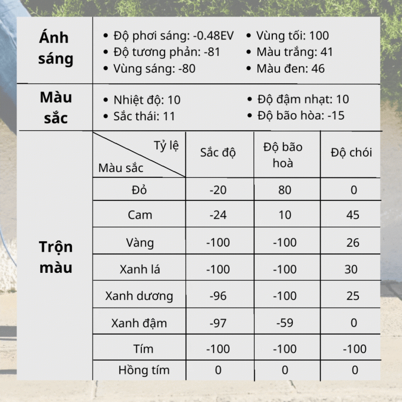 Bạn có thể tham khảo tỷ lệ chỉnh màu trong hình sau để có được bức ảnh ưng ý.