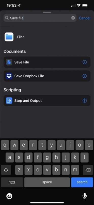 Bước 4. Sau đó, bạn tìm kiếm một lần nữa bằng cách chạm vào thanh tìm kiếm từ dưới cùng => Và Nhấn Gõ “Lưu Tệp/Save File” => Nhấn chọn hành động Lưu tệp .