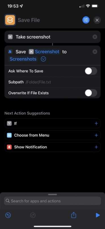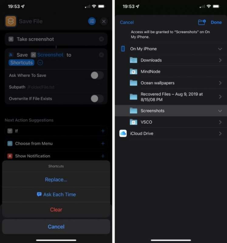 Bước 6. Bây giờ. hãy nhấp vào “Phím tắt” xuất hiện trên hành động “Lưu” => Sau đó nhấp vào tùy chọn “Thay thế”. => Tiếp theo, mở rộng Trên iPhone của tôi và chọn thư mục Ảnh chụp màn hình mà bạn đã tạo trong Phần #1 ở trên.