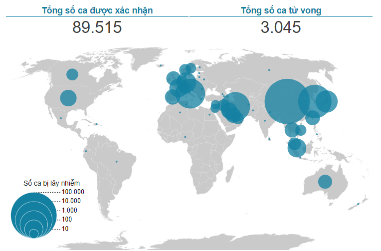 Bản đồ virus corona trên toàn cầu: tính tới ngày 3 tháng 3, 2020