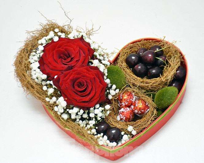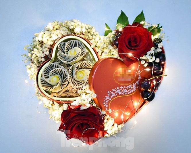 Điểm xuyết vào đó là những bông hồng đỏ rực rỡ và đặc biệt là những sợi đèn led tóc, có thể thắp sáng liên tục 2 ngày nhờ 3 viên pin nhỏ, khiến cả hộp quà sang rực lấp lánh trong đêm tình nhân lãng mạn.