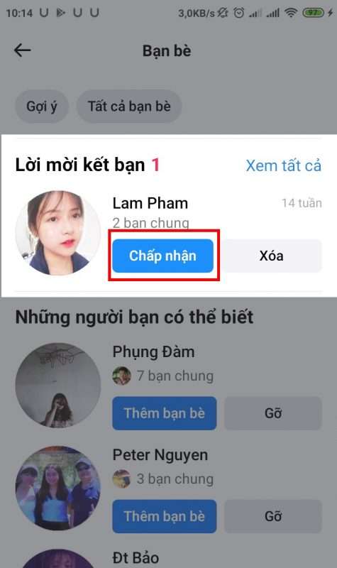 Bước 2. Trong phần Mời bạn bè, Bấm vào Chấp nhận trên tài khoản Facebook mà bạn muốn kết bạn.