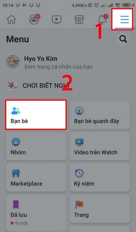 Bước 1. Vào Facebook => Nhấn chọn biểu tượng 3 gạch ngang góc trên cùng bên phải giao diện chính => Bấm chọn Bạn bè.