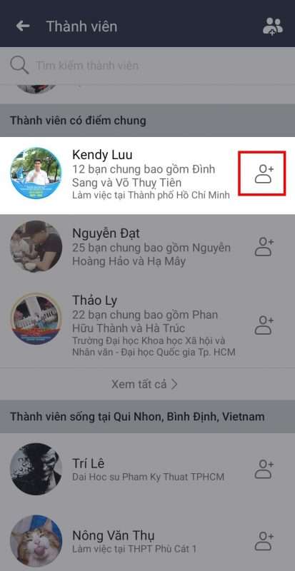 Bước 6. Sau đó, Kéo xuống dưới chọn biểu tượng kết bạn trên tài khoản Facebook mà bạn muốn kết bạn.