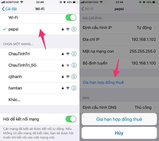Đầu tiên trên iPhone, bạn chọn Settings (cài đặt) > WiFi. Sau đó bạn chọn vào tên mạng đang gặp trục trặc. Chọn Renew Lease (gia hạn hợp đồng thuê) > Renew Lease (gia hạn hợp đồng thuê). Như vậy là hoàn thành quá trình thiết lập lại kết nối wifi.