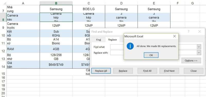 Ví dụ: thay thế tất cả khoảng trắng bằng việc xuống dòng, sử dụng Tổ hợp phím Ctrl + J (nhấn đồng thời Ctrl và J trong Replace with) => gõ dấu cách vào hộp Find What => sau đó nhấn Replace All.