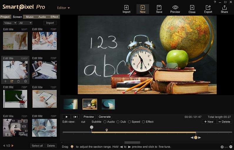 - Chức năng chỉnh sửa bài bao gồm cắt, hợp nhất, lồng tiếng và thêm phụ đề